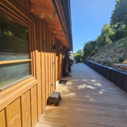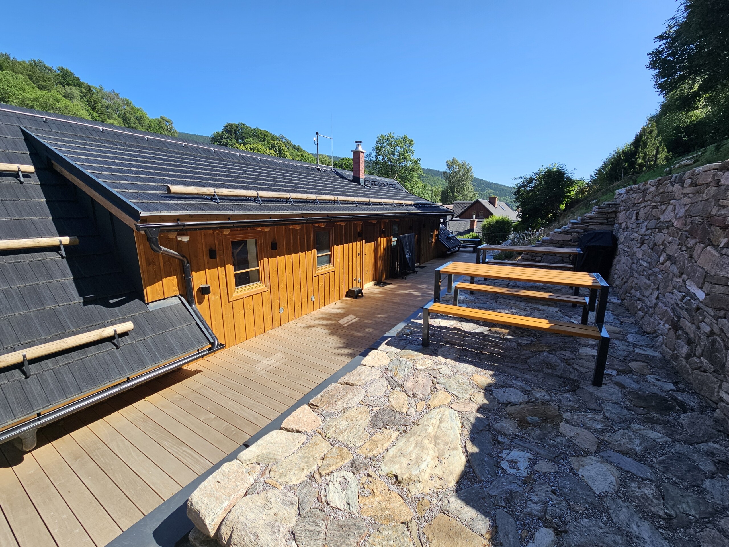 “Hospůdka” s posezením (TV, stoly, židle, PROFI pípa – na dotaz a za poplatek), koupelna (umyvadlo, vana, sprchový kout), samostatné WC.
