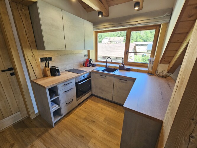 1. apartmán: společenská místnost (krb, stůl s posezením, TV, rozkládací pohovka – 2x přistýlka) s kuchyňským koutem (myčka nádobí, kávovar, varná konvice, trouba, mikrovlnná trouba, toustovač, sporák, lednice s mrazákem), 1x dvoulůžková ložnice (manželská postel), 1x třílůžková ložnice (manželská postel s patrovou postelí).