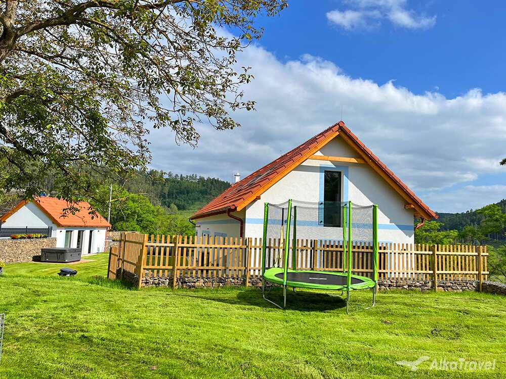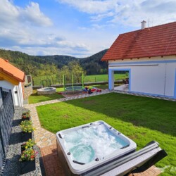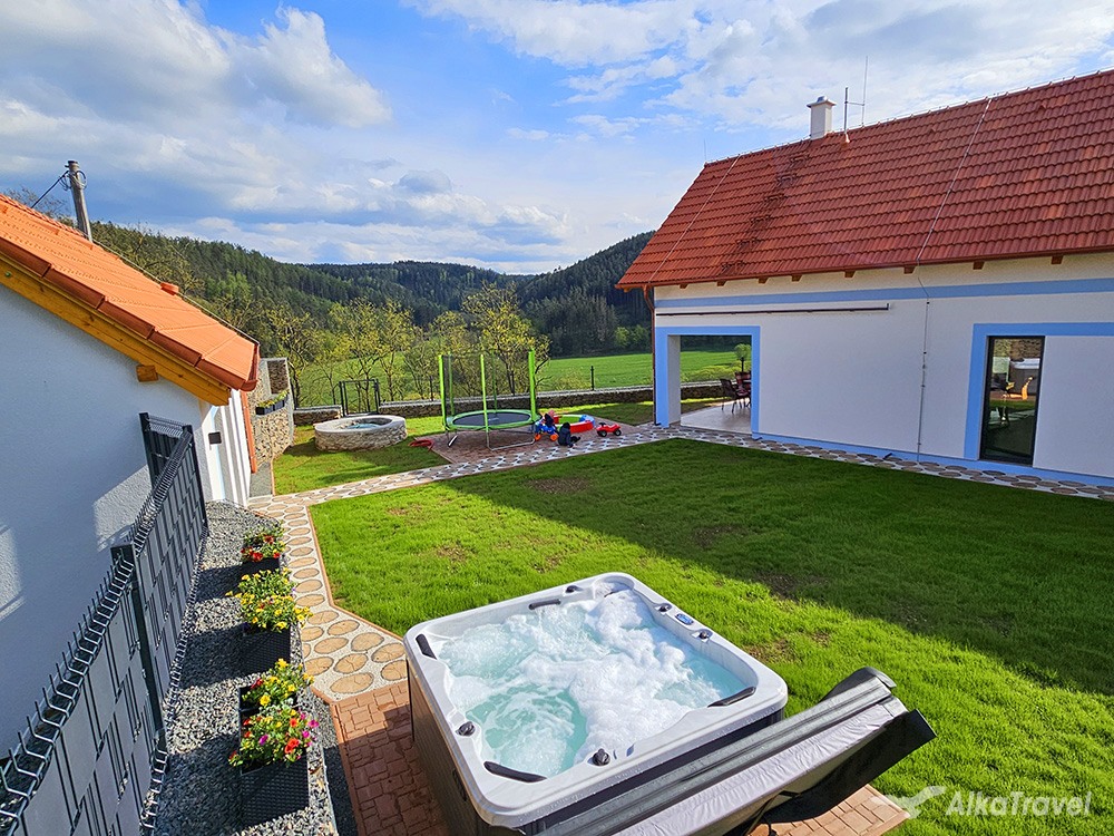 Patrová rekreační chalupa/dům, na klidném místě s výhledem na řeku Berounku (rybaření/sjíždění/koupání/odpočinek) s CELOROČNÍ VÍŘIVKOU, SAUNOU, letním BAZÉNEM, trampolínou, krytým posezením i dětským hřištěm u CHKO Křivoklátsko, 30 km od Plzně a necelou hodinu od Prahy v malé obci Rakolusky za obcí Bohy.