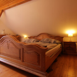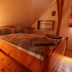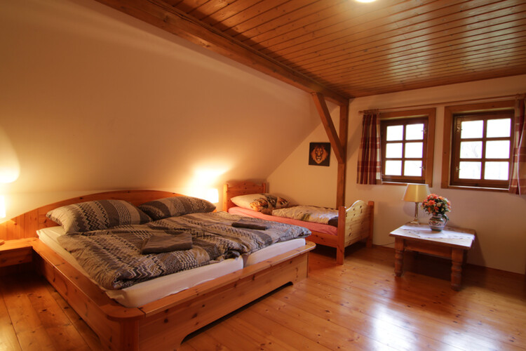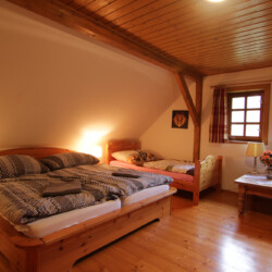 V objektu v patře: 1x čtyřlůžková ložnice (1x dvoulůžko, 2x lůžko), apartmán se dvěma ložnicemi – 1x dvolůžková ložnice (1x dvoulůžko) +, 1x dvolůžková ložnice (1x dvoulůžko), koupelna (vana, umyvadlo, WC).